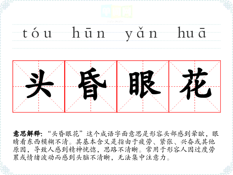“头昏眼花”这个成语字面意思是形容头部感到晕眩,眼睛看东西模糊不清。其基本含义是指由于疲劳、紧张、兴奋或其他原因,导致人感到精神恍惚,思路不清晰。常用于形容人因过度劳累或情绪波动而感到头脑不清晰,无法集中注意力。