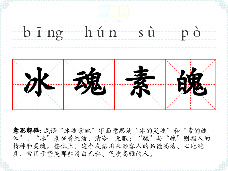 成语“冰魂素魄”字面意思是“冰的灵魂”和“素的魄体”。“冰”象征着纯洁、清冷、无暇;“魂”与“魄”则指人的精神和灵魂。整体上,这个成语用来形容人的品德高洁、心地纯真,常用于赞美那些清白无私、气质高雅的人。