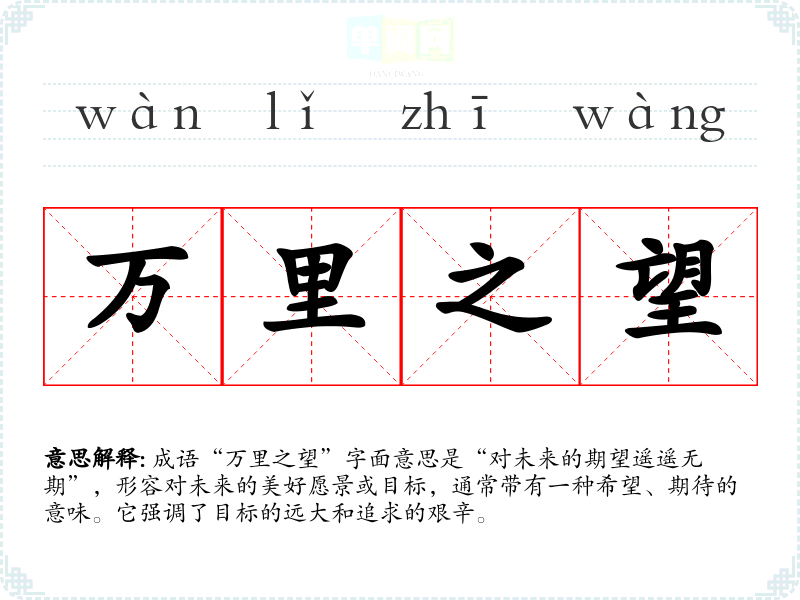 成语“万里之望”字面意思是“对未来的期望遥遥无期”,形容对未来的美好愿景或目标,通常带有一种希望、期待的意味。它强调了目标的远大和追求的艰辛。
