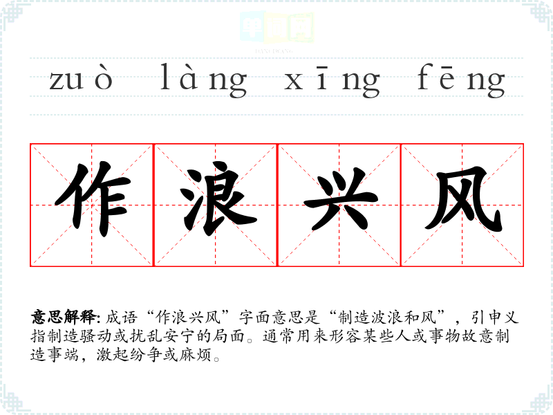 成语“作浪兴风”字面意思是“制造波浪和风”,引申义指制造骚动或扰乱安宁的局面。通常用来形容某些人或事物故意制造事端,激起纷争或麻烦。