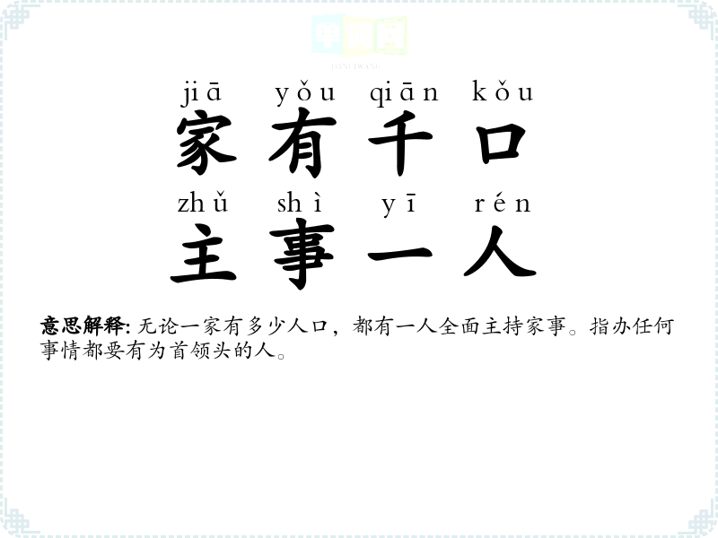 | 一客不烦二主 | 一位客人不用劳烦两位主人接待。比喻一件事情由一个人全部承担,不用找别人帮忙。 |