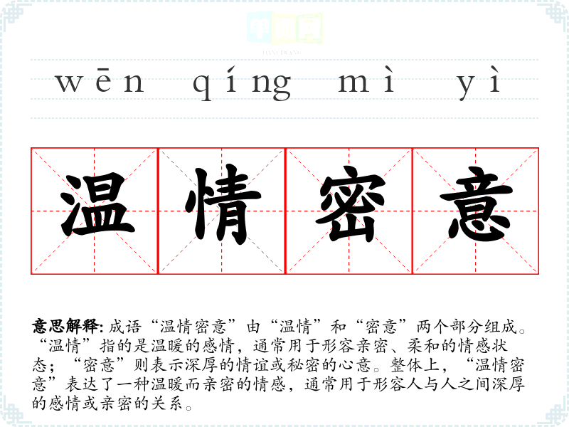 成语“温情密意”由“温情”和“密意”两个部分组成。“温情”指的是温暖的感情,通常用于形容亲密、柔和的情感状态;“密意”则表示深厚的情谊或秘密的心意。整体上,“温情密意”表达了一种温暖而亲密的情感,通常用于形容人与人之间深厚的感情或亲密的关系。