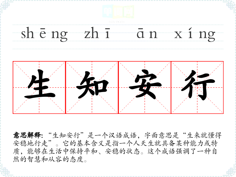 “生知安行”是一个汉语成语,字面意思是“生来就懂得安稳地行走”。它的基本含义是指一个人天生就具备某种能力或特质,能够在生活中保持平和、安稳的状态。这个成语强调了一种自然的智慧和从容的态度。