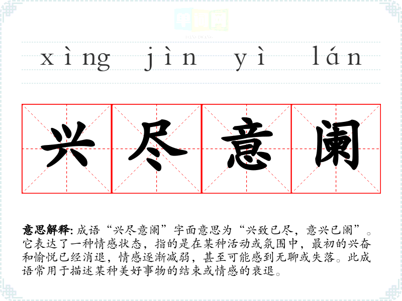 成语“兴尽意阑”字面意思为“兴致已尽,意兴已阑”。它表达了一种情感状态,指的是在某种活动或氛围中,最初的兴奋和愉悦已经消退,情感逐渐减弱,甚至可能感到无聊或失落。此成语常用于描述某种美好事物的结束或情感的衰退。