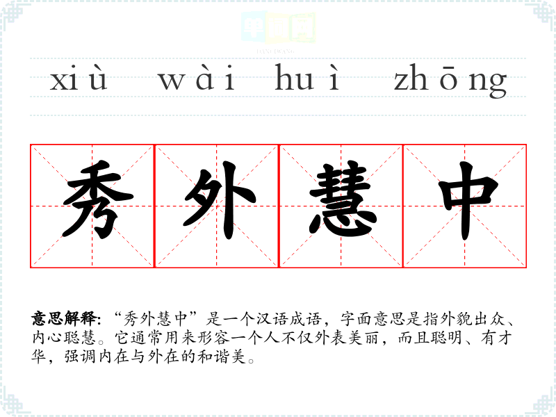 “秀外慧中”是一个汉语成语,字面意思是指外貌出众、内心聪慧。它通常用来形容一个人不仅外表美丽,而且聪明、有才华,强调内在与外在的和谐美。