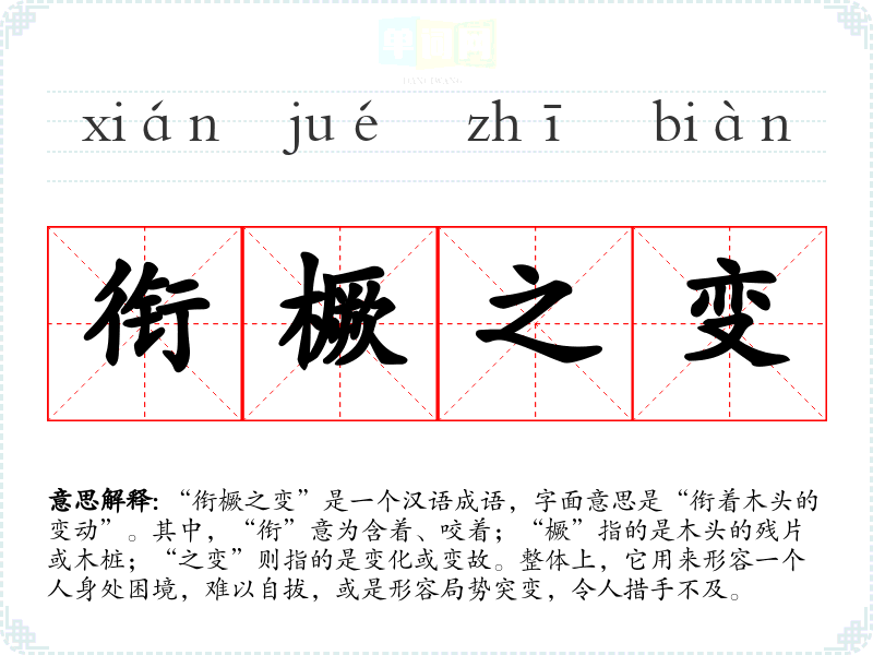 “衔橛之变”是一个汉语成语,字面意思是“衔着木头的变动”。其中,“衔”意为含着、咬着;“橛”指的是木头的残片或木桩;“之变”则指的是变化或变故。整体上,它用来形容一个人身处困境,难以自拔,或是形容局势突变,令人措手不及。