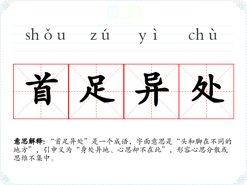 “首足异处”是一个成语,字面意思是“头和脚在不同的地方”,引申义为“身处异地、心思却不在此”,形容心思分散或思维不集中。