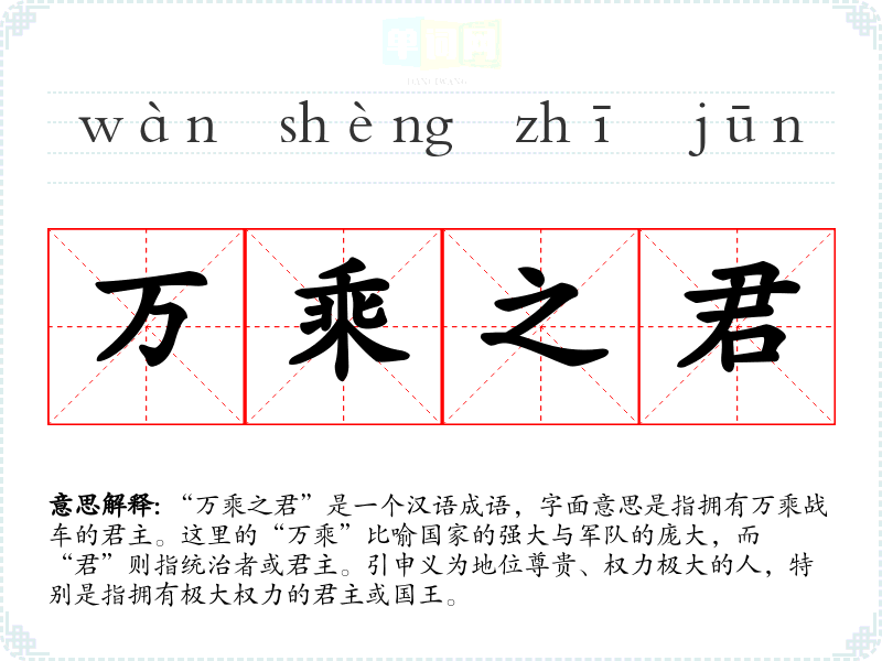 “万乘之君”是一个汉语成语,字面意思是指拥有万乘战车的君主。这里的“万乘”比喻国家的强大与军队的庞大,而“君”则指统治者或君主。引申义为地位尊贵、权力极大的人,特别是指拥有极大权力的君主或国王。