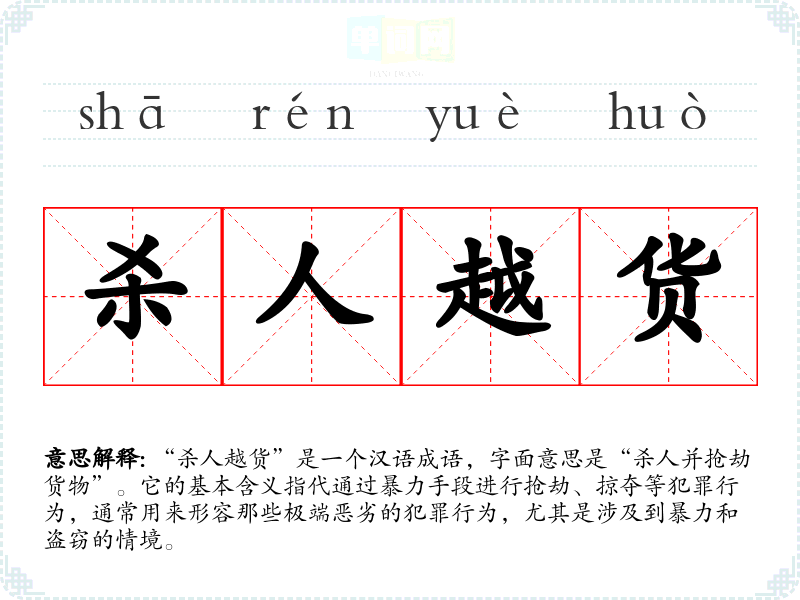 | 杀人越货 | 越:抢劫。害人性命,抢人东西。指盗匪的行为。 |