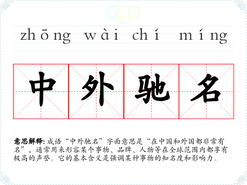 | 中外驰名 | 驰名:名声远扬。名声传遍了国内外。 |
