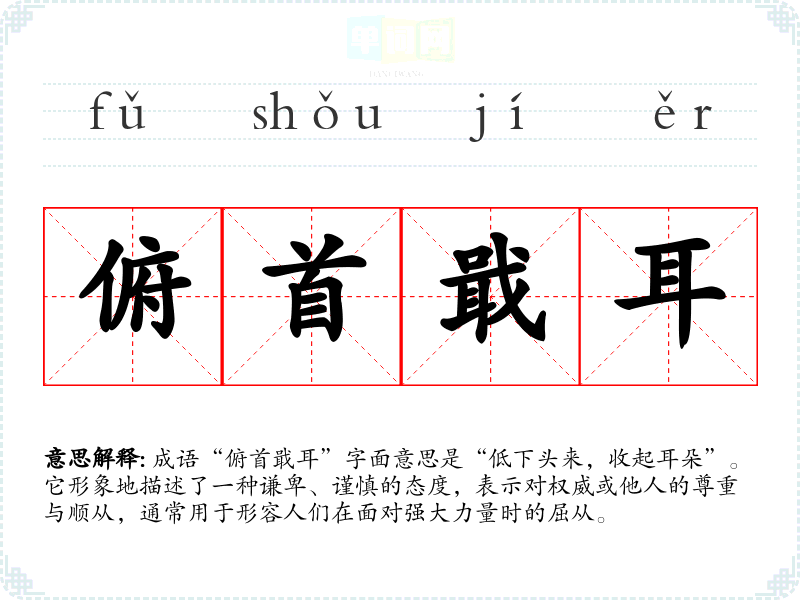 成语“俯首戢耳”字面意思是“低下头来,收起耳朵”。它形象地描述了一种谦卑、谨慎的态度,表示对权威或他人的尊重与顺从,通常用于形容人们在面对强大力量时的屈从。