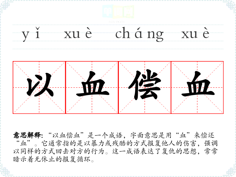 “以血偿血”是一个成语,字面意思是用“血”来偿还“血”。它通常指的是以暴力或残酷的方式报复他人的伤害,强调以同样的方式回击对方的行为。这一成语表达了复仇的思想,常常暗示着无休止的报复循环。