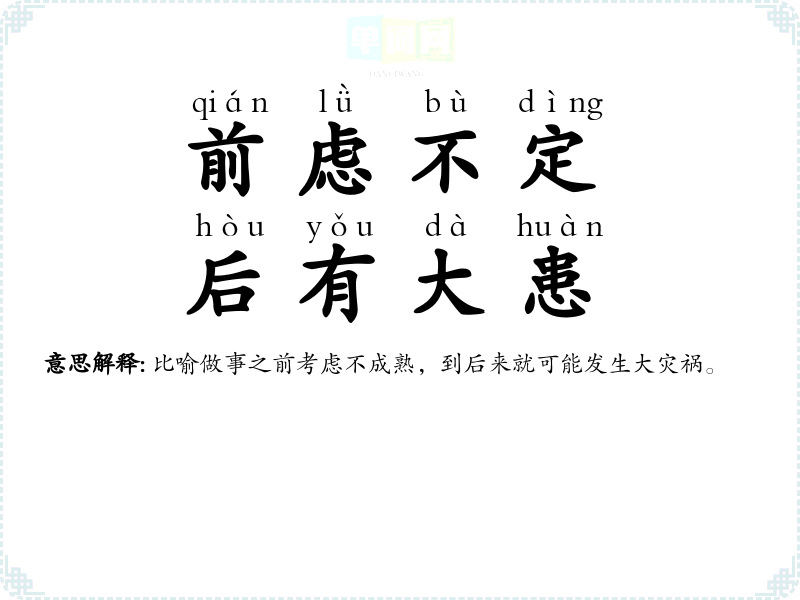 | 前虑不定,后有大患 | 比喻做事之前考虑不成熟,到后来就可能发生大灾祸。 |