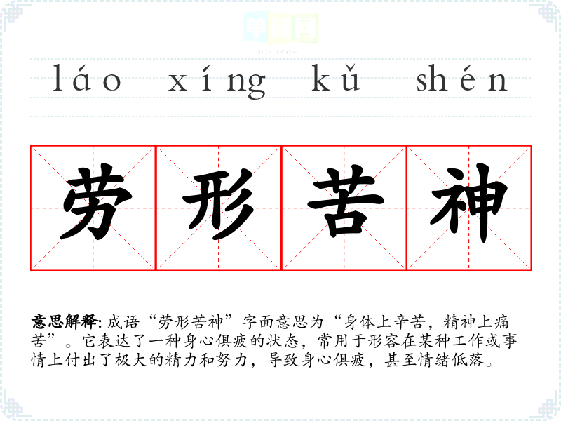 成语“劳形苦神”字面意思为“身体上辛苦,精神上痛苦”。它表达了一种身心俱疲的状态,常用于形容在某种工作或事情上付出了极大的精力和努力,导致身心俱疲,甚至情绪低落。
