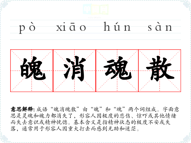 成语“魄消魂散”由“魄”和“魂”两个词组成。字面意思是灵魂和魄力都消失了,形容人因极度的悲伤、惊吓或其他情绪而失去意识或精神恍惚。基本含义是指精神状态的极度不安或失落,通常用于形容人因重大打击而感到无助和迷茫。