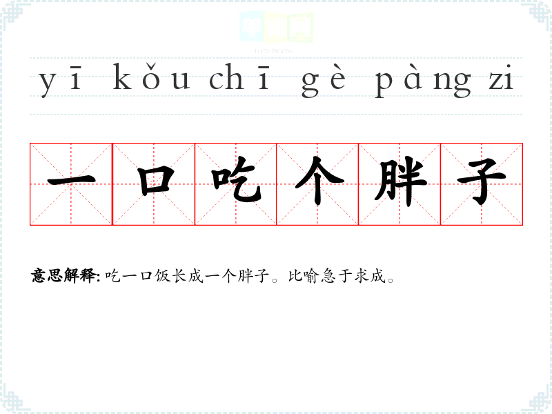 | 一口吃个胖子 | 吃一口饭长成一个胖子。比喻急于求成。 |