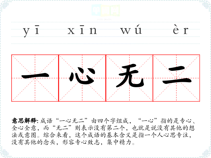 成语“一心无二”由四个字组成,“一心”指的是专心、全心全意,而“无二”则表示没有第二个,也就是说没有其他的想法或意图。综合来看,这个成语的基本含义是指一个人心思专注,没有其他的念头,形容专心致志,集中精力。