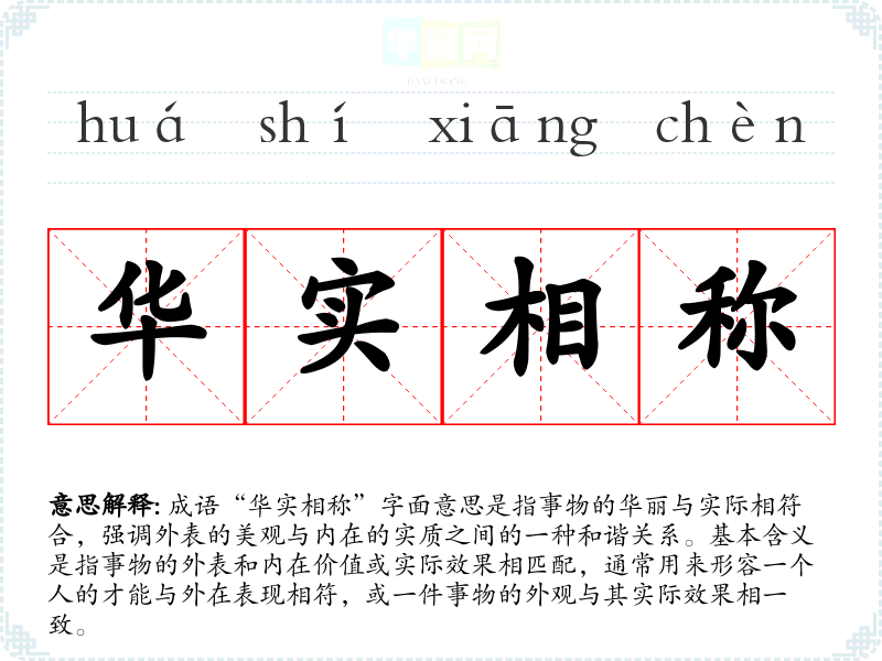 成语“华实相称”字面意思是指事物的华丽与实际相符合,强调外表的美观与内在的实质之间的一种和谐关系。基本含义是指事物的外表和内在价值或实际效果相匹配,通常用来形容一个人的才能与外在表现相符,或一件事物的外观与其实际效果相一致。