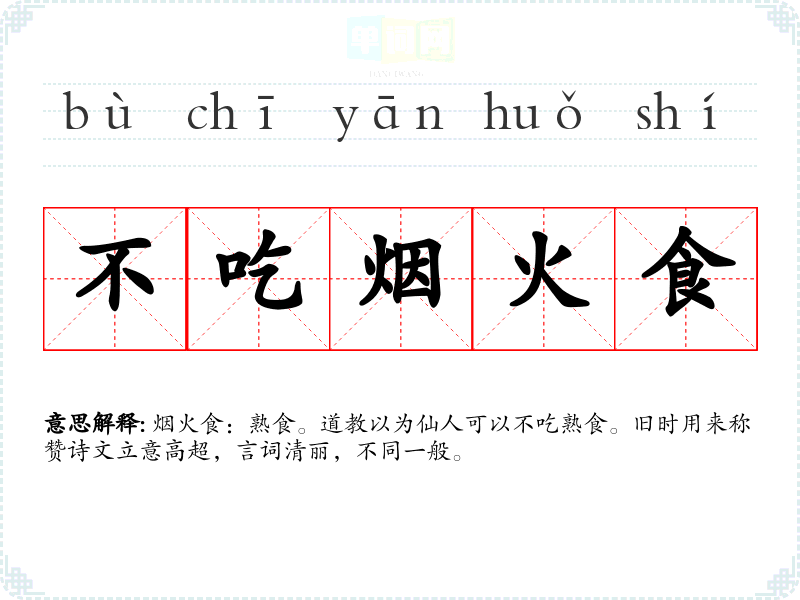 | 不吃烟火食 | 烟火食:熟食。道教以为仙人可以不吃熟食。旧时用来称赞诗文立意高超,言词清丽,不同一般。 |