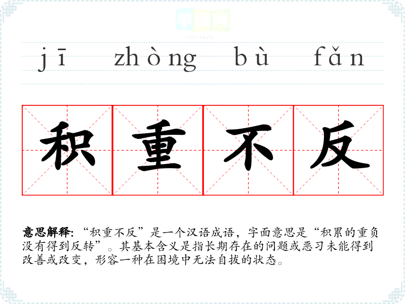 “积重不反”是一个汉语成语,字面意思是“积累的重负没有得到反转”。其基本含义是指长期存在的问题或恶*未能得到改善或改变,形容一种在困境中无法自拔的状态。