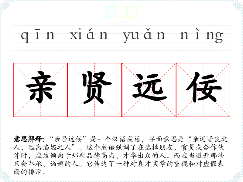 “亲贤远佞”是一个汉语成语,字面意思是“亲近贤良之人,远离谄媚之人”。这个成语强调了在选择朋友、官员或合作伙伴时,应该倾向于那些品德高尚、才华出众的人,而应当避开那些只会奉承、谄媚的人。它传达了一种对真才实学的重视和对虚假表面的排斥。