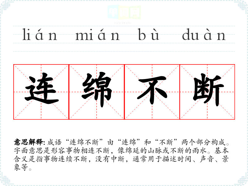 成语“连绵不断”由“连绵”和“不断”两个部分构成。字面意思是形容事物相连不断,像绵延的山脉或不断的雨水。基本含义是指事物连续不断,没有中断,通常用于描述时间、声音、景象等。