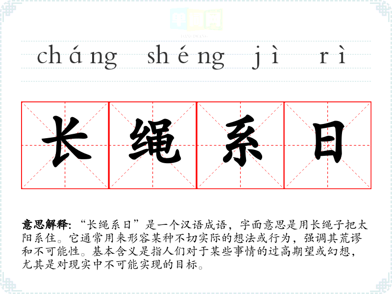 “长绳系日”是一个汉语成语,字面意思是用长绳子把太阳系住。它通常用来形容某种不切实际的想法或行为,强调其荒谬和不可能性。基本含义是指人们对于某些事情的过高期望或幻想,尤其是对现实中不可能实现的目标。