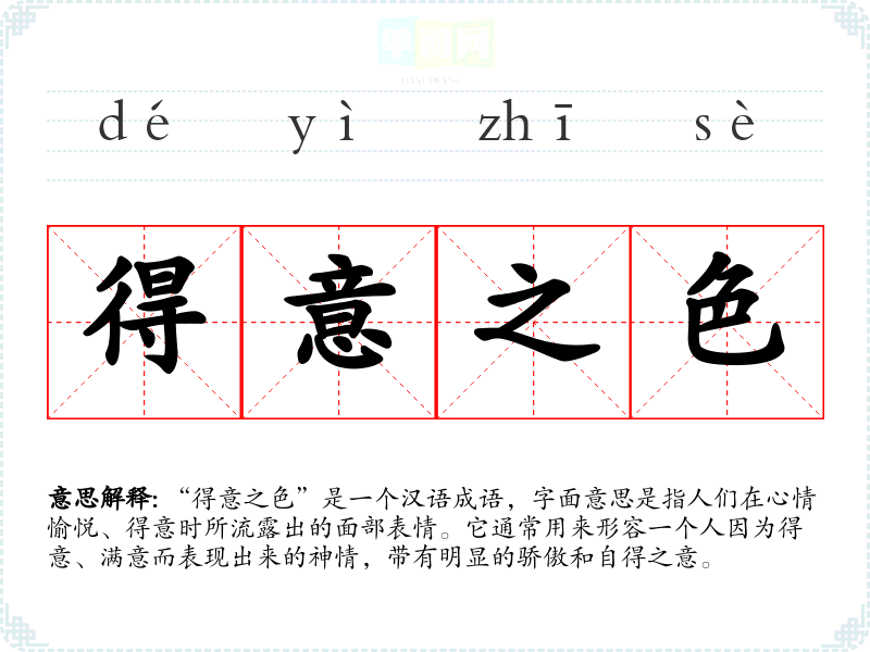“得意之色”是一个汉语成语,字面意思是指人们在心情愉悦、得意时所流露出的面部表情。它通常用来形容一个人因为得意、满意而表现出来的神情,带有明显的骄傲和自得之意。