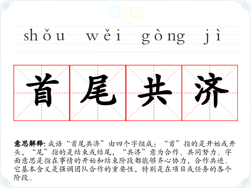 成语“首尾共济”由四个字组成:“首”指的是开始或开头,“尾”指的是结束或结尾,“共济”意为合作、共同努力。字面意思是指在事情的开始和结束阶段都能够齐心协力,合作共进。它基本含义是强调团队合作的重要性,特别是在项目或任务的各个阶段。