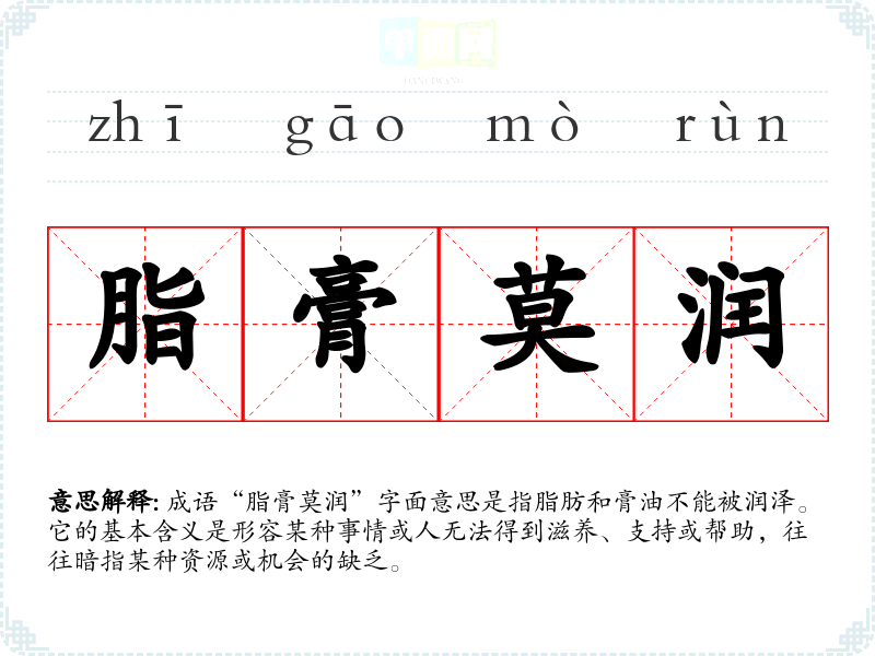 成语“脂膏莫润”字面意思是指脂肪和膏油不能被润泽。它的基本含义是形容某种事情或人无法得到滋养、支持或帮助,往往暗指某种资源或机会的缺乏。