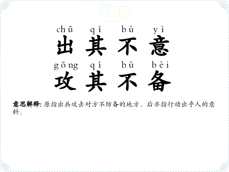 | 出其不意,攻其不备 | 原指出兵攻击对方不防备的地方。后亦指行动出乎人的意料。 |