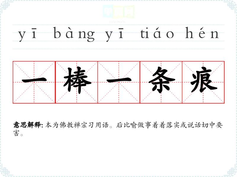 | 一棒一条痕 | 本为佛教禅宗习用语。后比喻做事着着落实或说话切中要害。 |
