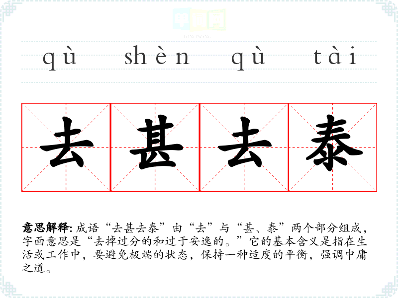 成语“去甚去泰”由“去”与“甚、泰”两个部分组成,字面意思是“去掉过分的和过于安逸的。”它的基本含义是指在生活或工作中,要避免极端的状态,保持一种适度的平衡,强调中庸之道。