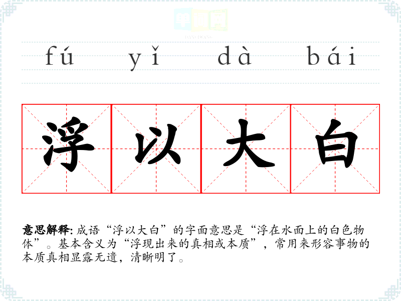 成语“浮以大白”的字面意思是“浮在水面上的白色物体”。基本含义为“浮现出来的真相或本质”,常用来形容事物的本质真相显露无遗,清晰明了。