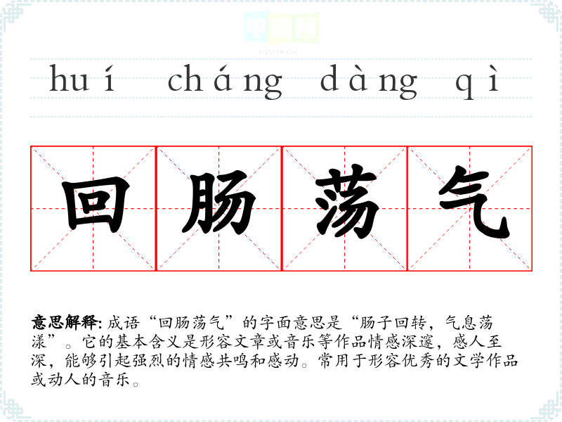 成语“回肠荡气”的字面意思是“肠子回转,气息荡漾”。它的基本含义是形容文章或音乐等作品情感深邃,感人至深,能够引起强烈的情感共鸣和感动。常用于形容优秀的文学作品或动人的音乐。