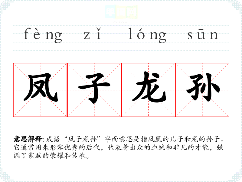 成语“凤子龙孙”字面意思是指凤凰的儿子和龙的孙子。它通常用来形容优秀的后代,代表着出众的血统和非凡的才能,强调了家族的荣耀和传承。