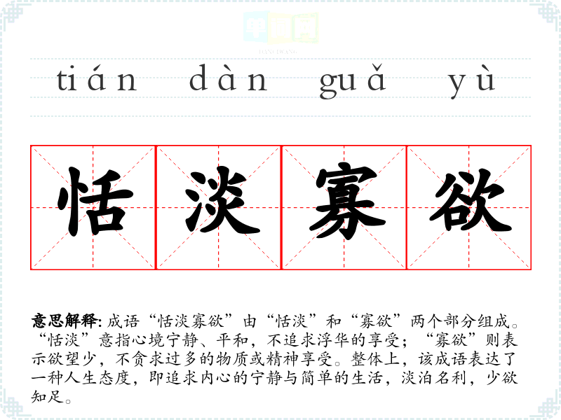 成语“恬淡寡欲”由“恬淡”和“寡欲”两个部分组成。“恬淡”意指心境宁静、平和,不追求浮华的享受;“寡欲”则表示欲望少,不贪求过多的物质或精神享受。整体上,该成语表达了一种人生态度,即追求内心的宁静与简单的生活,淡泊名利,少欲知足。