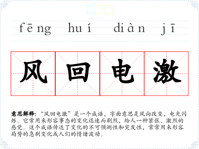 通过对“风回电激”的学,我更加理解了语言中蕴含的丰富文化和情感。这个成语不仅仅是一个描述变化的工具,更是人们对生活无常的一种感慨。在我的语言学和表达中,它提醒我要关注变化,勇于面对生活中的不确定性。