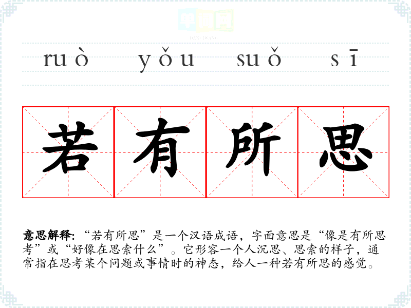 “若有所思”是一个汉语成语,字面意思是“像是有所思考”或“好像在思索什么”。它形容一个人沉思、思索的样子,通常指在思考某个问题或事情时的神态,给人一种若有所思的感觉。