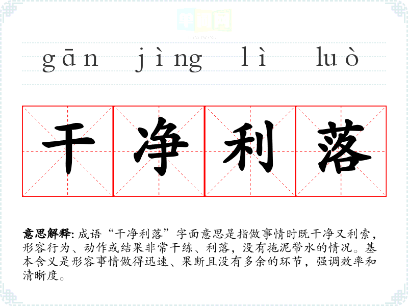 成语“干净利落”字面意思是指做事情时既干净又利索,形容行为、动作或结果非常干练、利落,没有拖泥带水的情况。基本含义是形容事情做得迅速、果断且没有多余的环节,强调效率和清晰度。