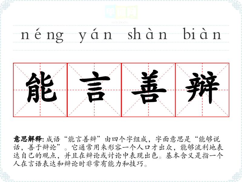 成语“能言善辩”由四个字组成,字面意思是“能够说话,善于辩论”。它通常用来形容一个人口才出众,能够流利地表达自己的观点,并且在辩论或讨论中表现出色。基本含义是指一个人在言语表达和辩论时非常有能力和技巧。