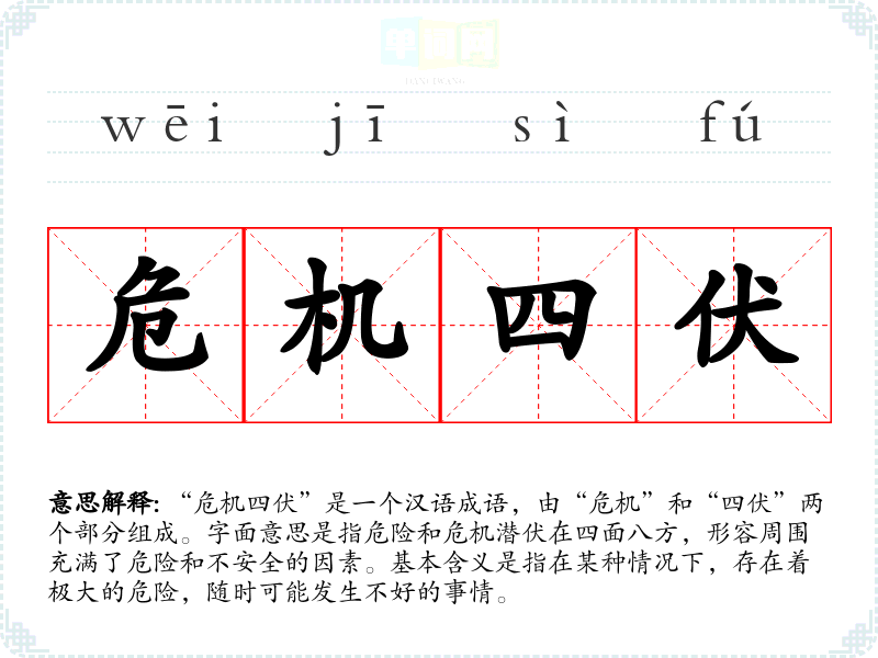 - 日常对话中,可以用来形容某种不安定的局势,比如“最近市场情况不太好,危机四伏。”