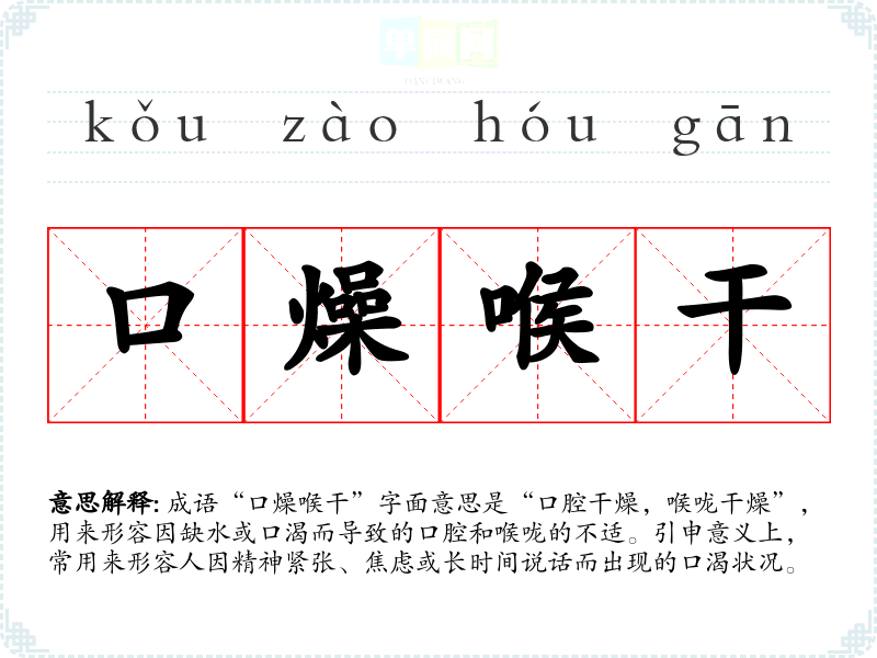 成语“口燥喉干”字面意思是“口腔干燥,喉咙干燥”,用来形容因缺水或口渴而导致的口腔和喉咙的不适。引申意义上,常用来形容人因精神紧张、焦虑或长时间说话而出现的口渴状况。