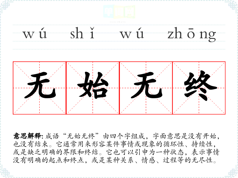 成语“无始无终”由四个字组成,字面意思是没有开始,也没有结束。它通常用来形容某件事情或现象的循环性、持续性,或是缺乏明确的界限和终结。它也可以引申为一种状态,表示事情没有明确的起点和终点,或是某种关系、情感、过程等的无尽性。