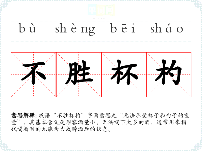 成语“不胜杯杓”字面意思是“无法承受杯子和勺子的重量”。其基本含义是形容酒量小,无法喝下太多的酒,通常用来指代喝酒时的无能为力或醉酒后的状态。