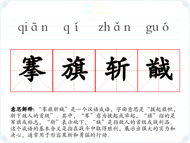 “搴旗斩馘”是一个汉语成语,字面意思是“拔起旗帜,斩下敌人的首级”。其中,“搴”意为拔起或举起,“旗”指的是军旗或标志,“斩”表示砍下,“馘”是指敌人的首级或战利品。这个成语的基本含义是指在战斗中取得胜利,展示出强大的实力和决心,通常用于形容果断和勇猛的行动。