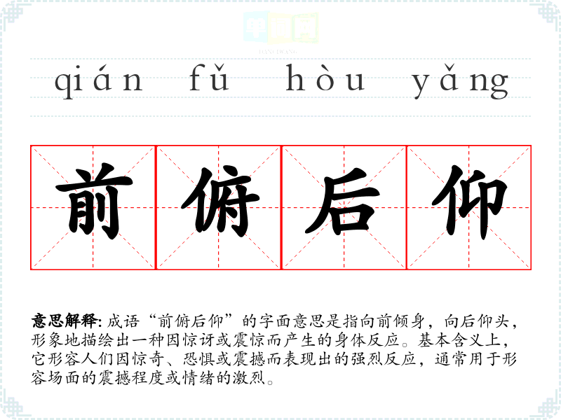 “前俯后仰”来源于古代文献,但具体出处并不明确。它可能反映了古代人们在面对突发**时的真实反应,随着时间的推移,这一表达逐渐被固定为成语,用于描述震撼或惊奇的情感状态。