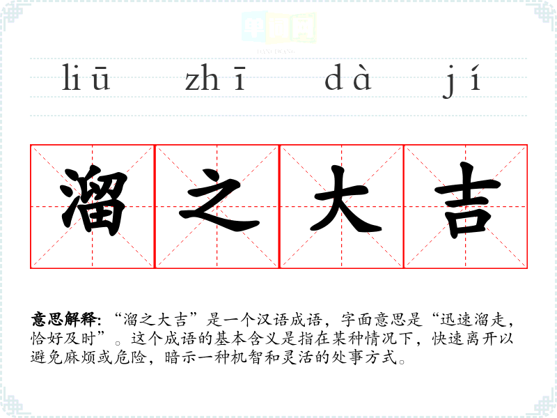 “溜之大吉”是一个汉语成语,字面意思是“迅速溜走,恰好及时”。这个成语的基本含义是指在某种情况下,快速离开以避免麻烦或危险,暗示一种机智和灵活的处事方式。