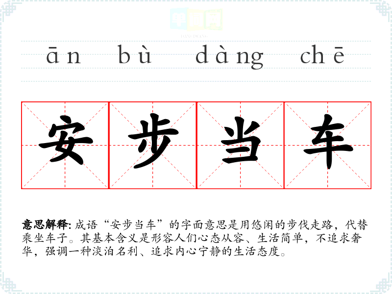成语“安步当车”的字面意思是用悠闲的步伐走路,代替乘坐车子。其基本含义是形容人们心态从容、生活简单,不追求奢华,强调一种淡泊名利、追求内心宁静的生活态度。