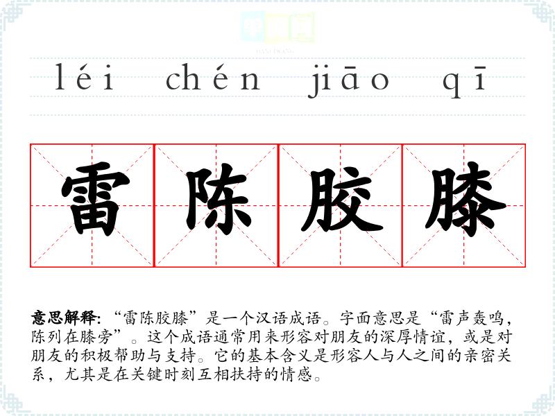 “雷陈胶膝”是一个汉语成语。字面意思是“雷声轰鸣,陈列在膝旁”。这个成语通常用来形容对朋友的深厚情谊,或是对朋友的积极帮助与支持。它的基本含义是形容人与人之间的亲密关系,尤其是在关键时刻互相扶持的情感。